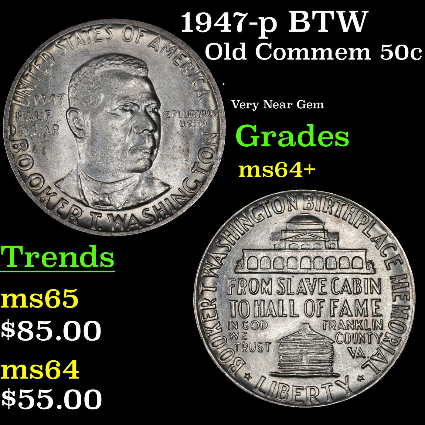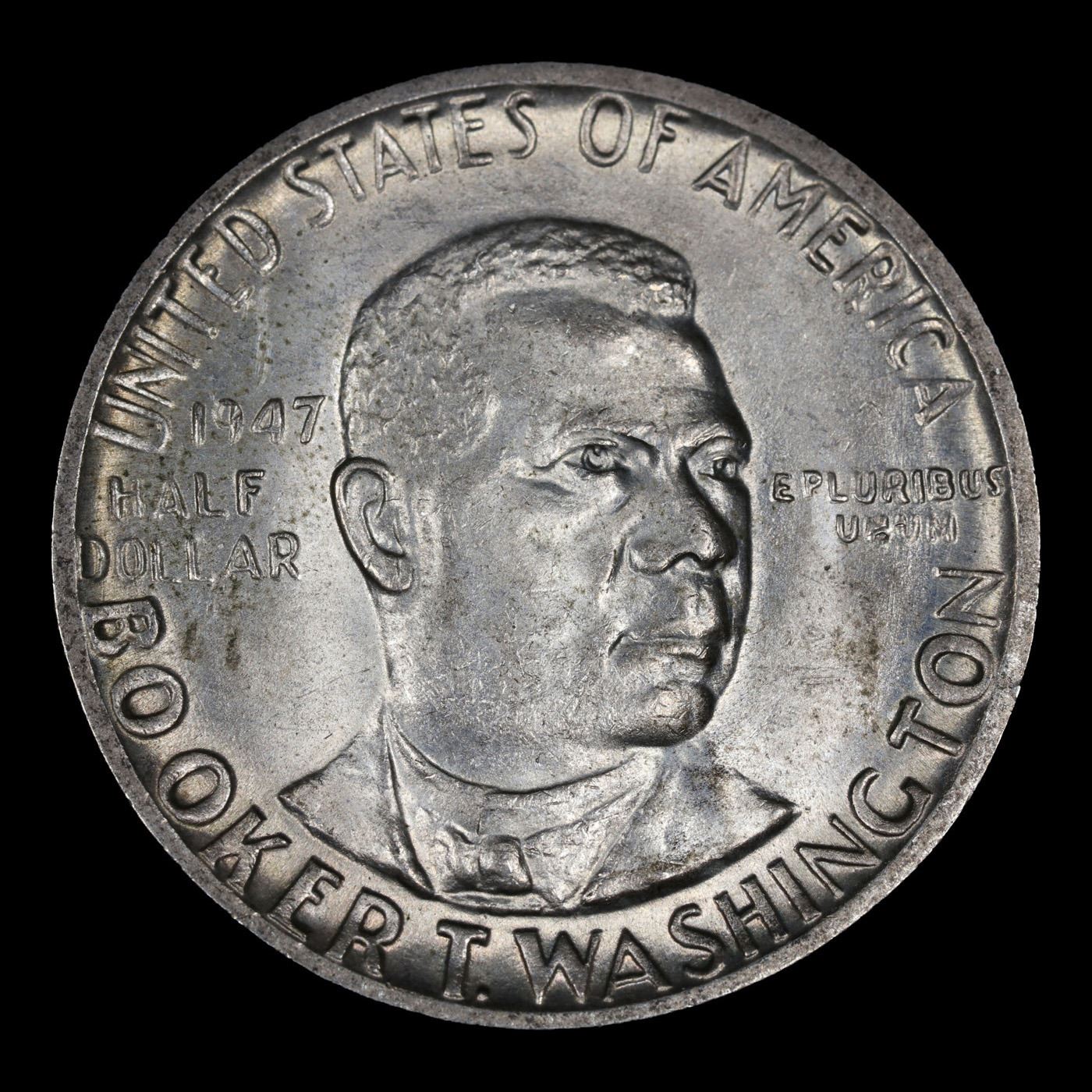 1947-p BTW Old Commem Half Dollar 50c Grades Choice+ Unc. When examining a Booker T. Washington commemorative look for wear on the high points, on the obverse that is Mr. Washington's right Cheek (from his perspective), and on the reverse the arches on the top building.