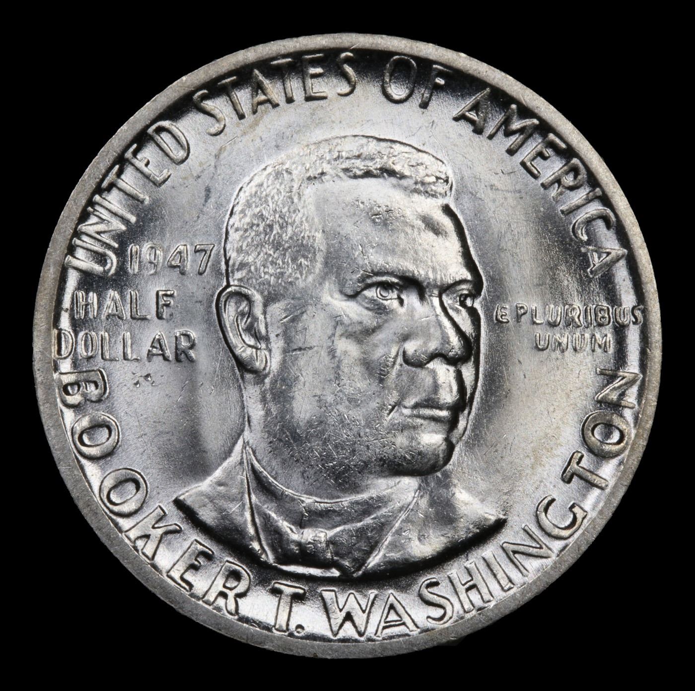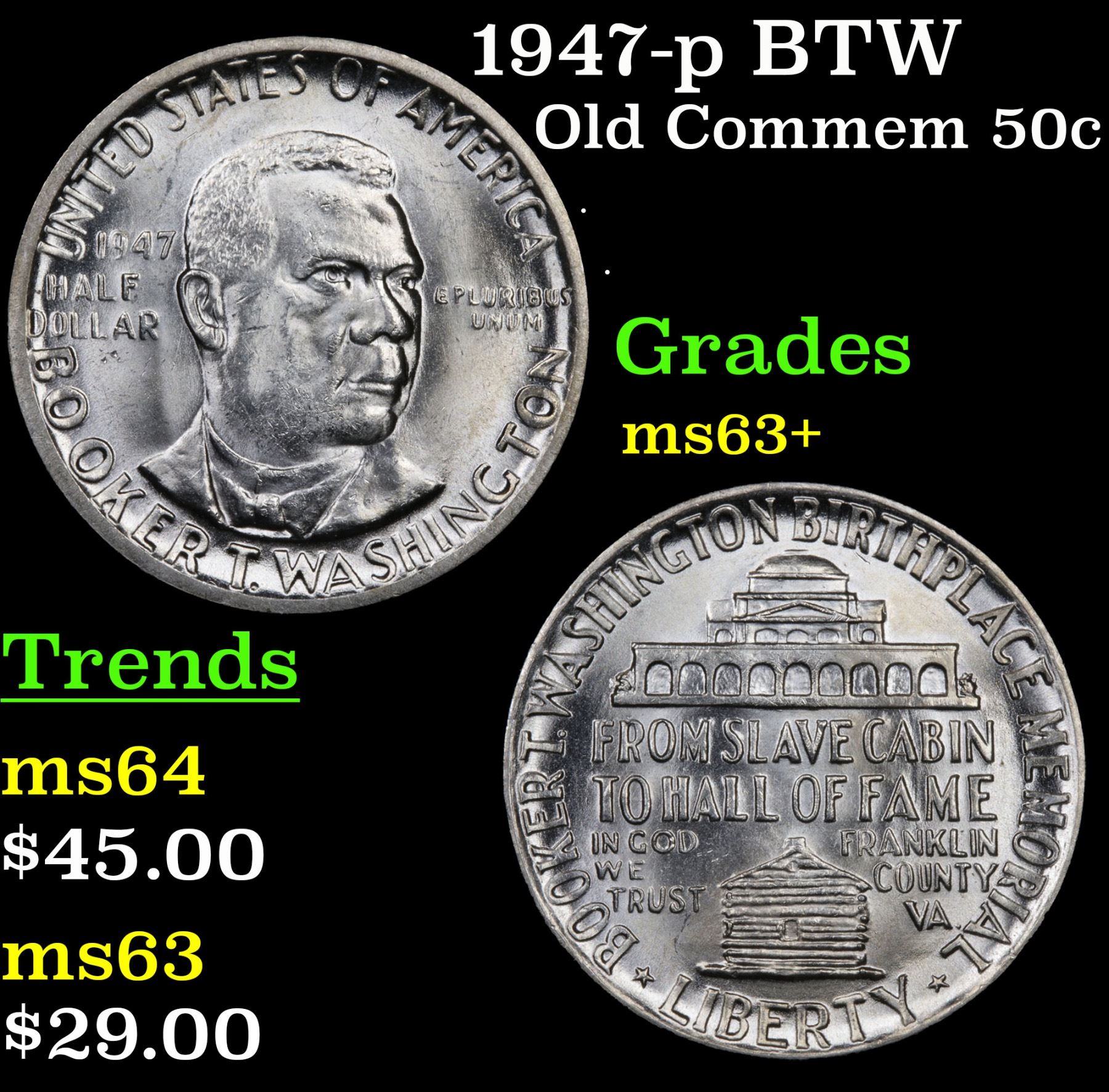 1947-p BTW Old Commem Half Dollar 50c Grades Select+ Unc. When examining a Booker T. Washington commemorative look for wear on the high points, on the obverse that is Mr. Washington's right Cheek (from his perspective), and on the reverse the arches on the top building.