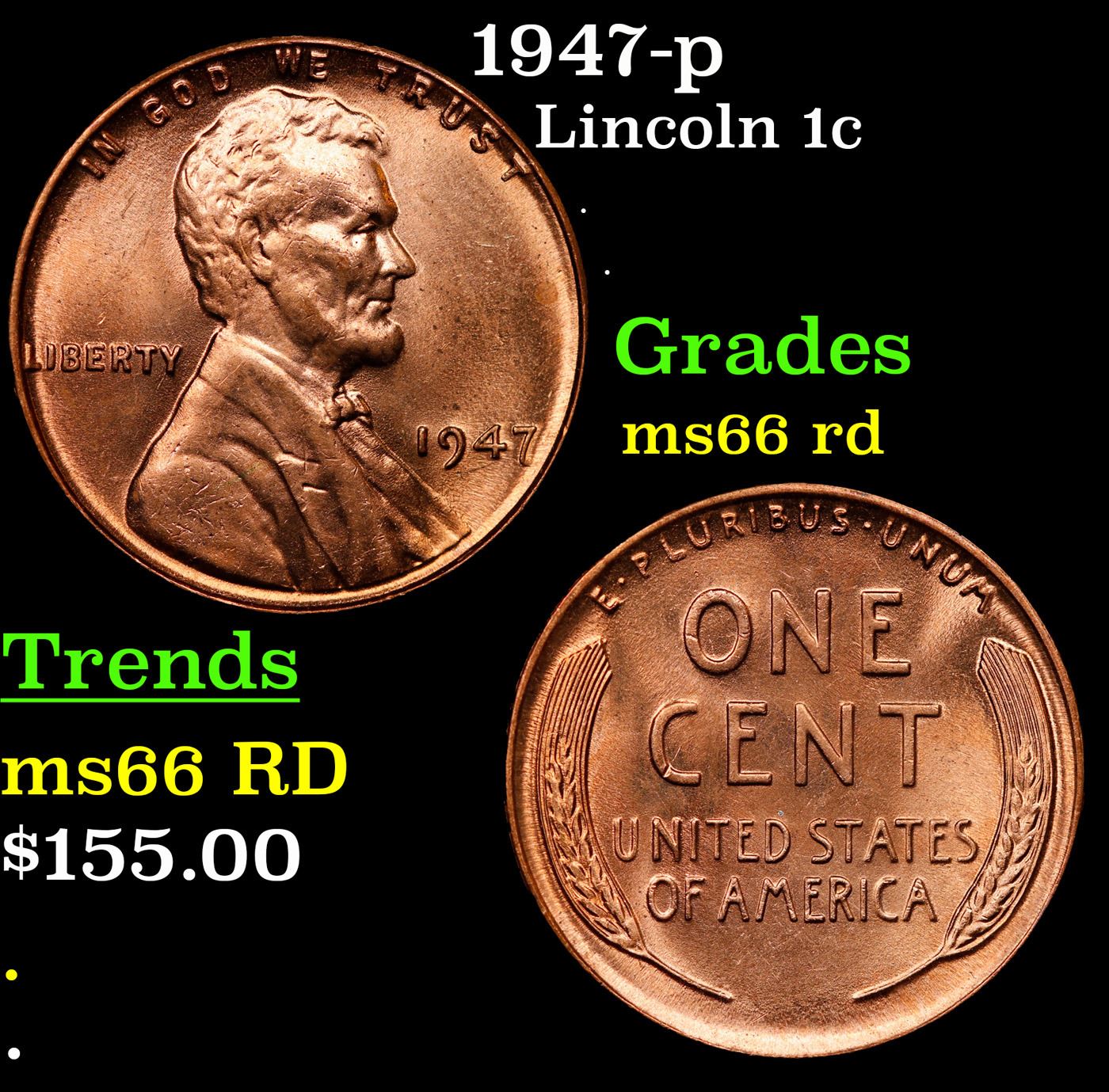 1947-p Lincoln Cent 1c Grades GEM+ Unc RD.