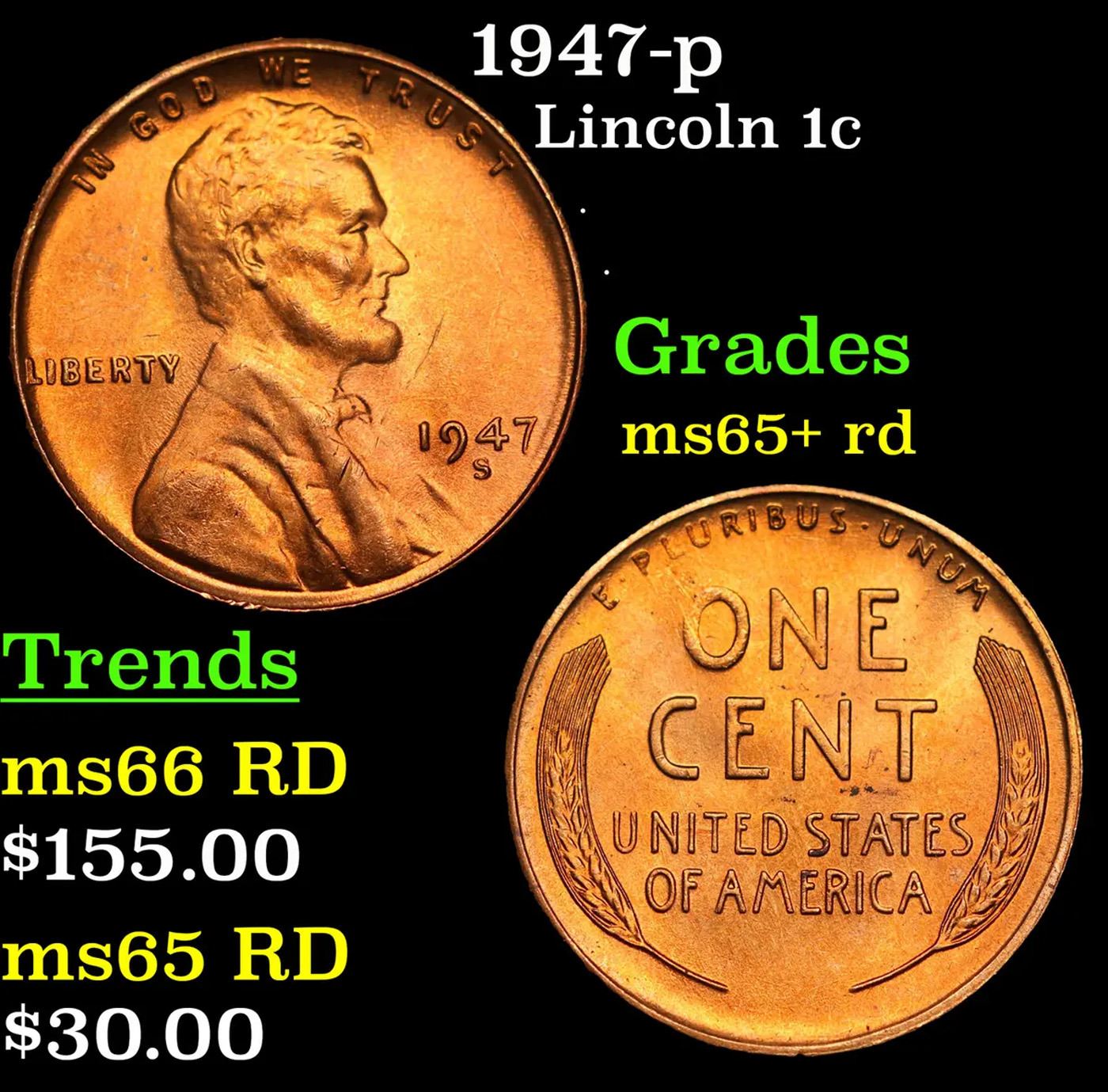 1947-p Lincoln Cent 1c Grades Gem+ Unc RD.