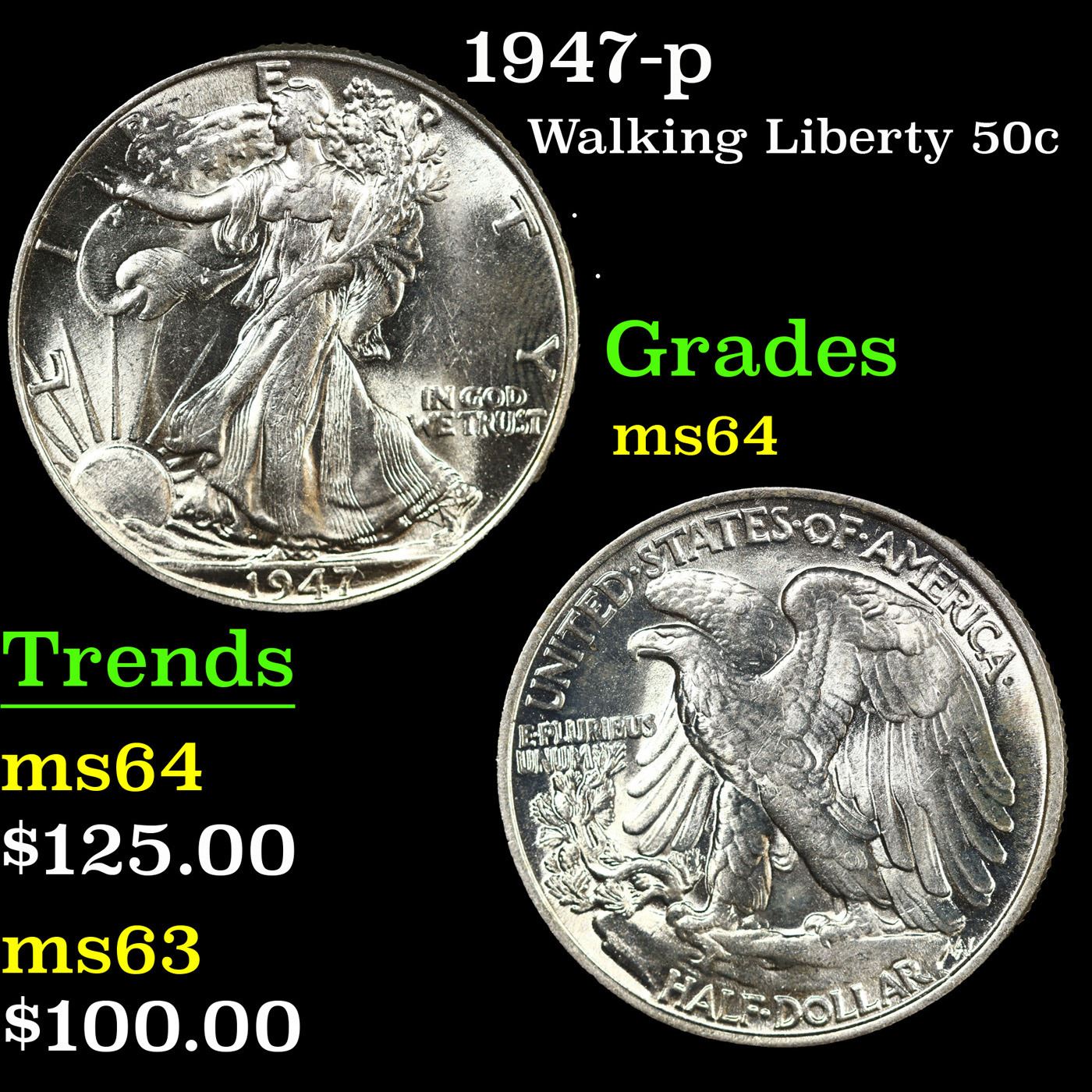 1947-p Walking Liberty Half Dollar 50c Grades Choice Unc.