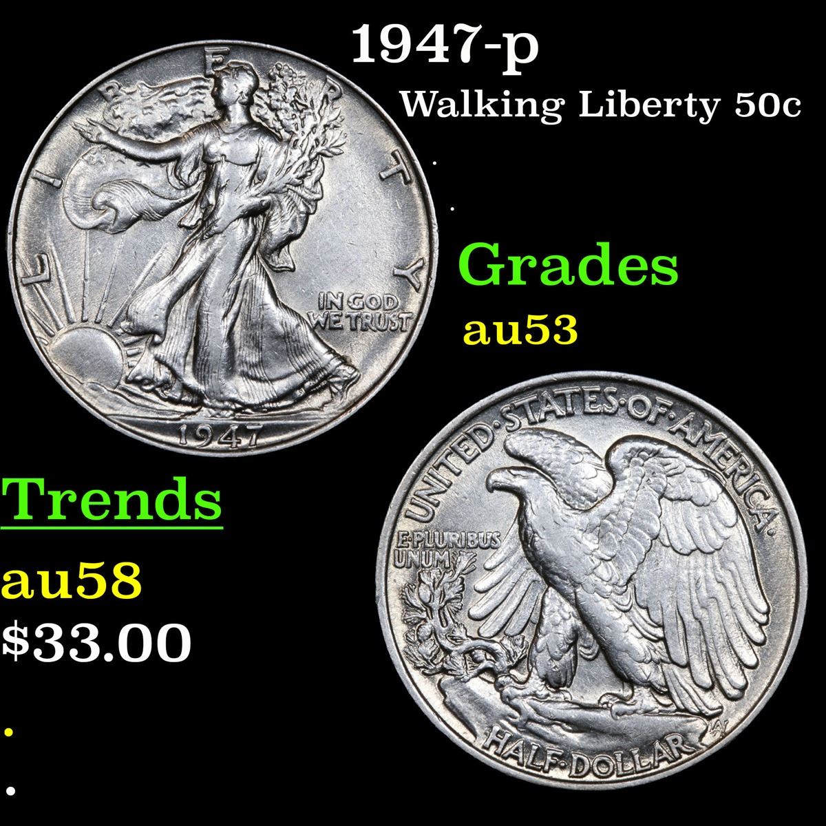 1947-p . . Walking Liberty Half Dollar 50c Grades Select AU.