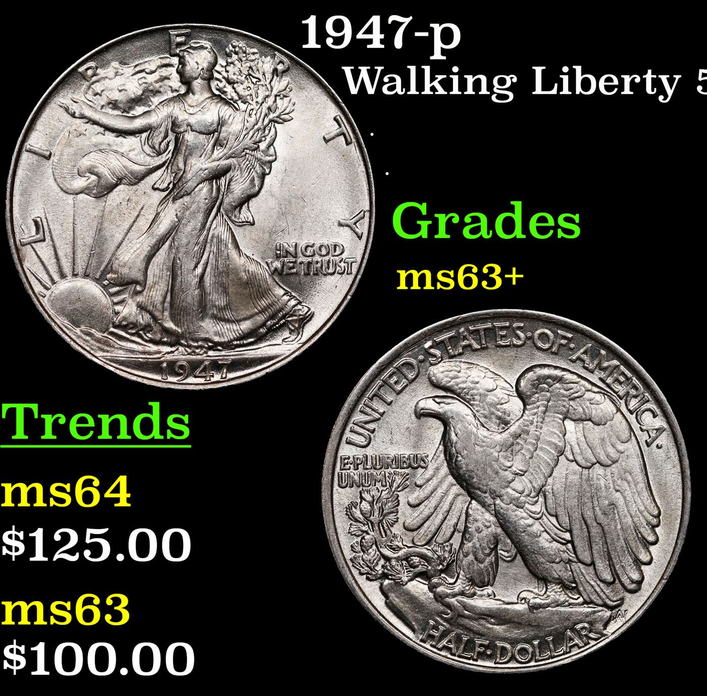 1947-p Walking Liberty Half Dollar 50c Grades Select+ Unc.