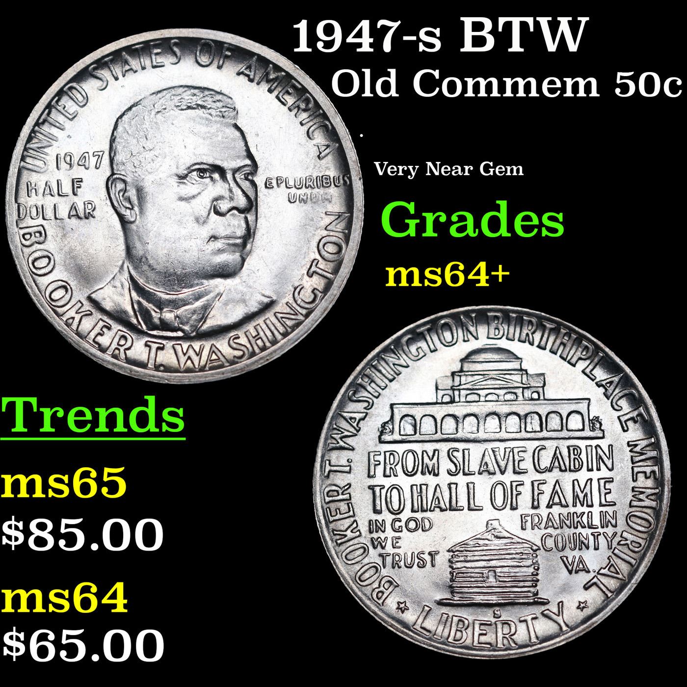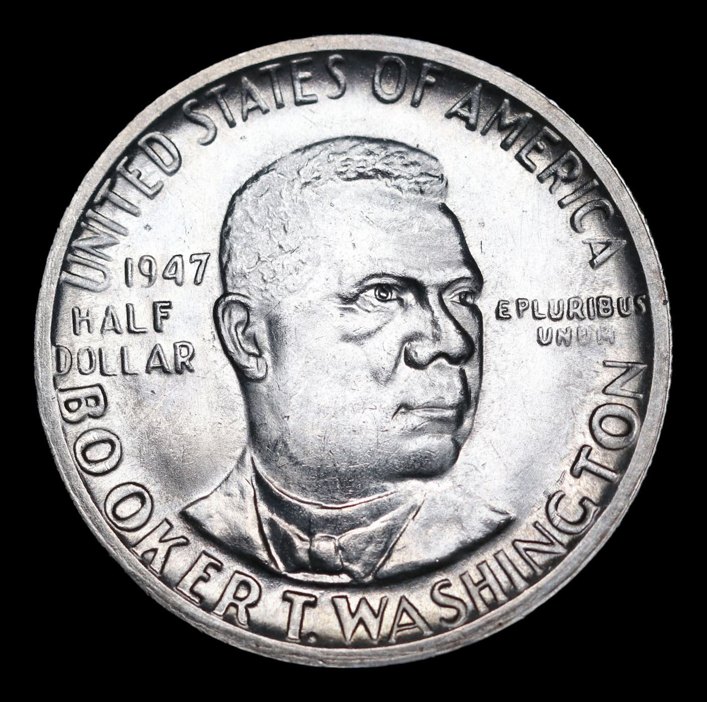 1947-s BTW Old Commem Half Dollar 50c Grades Choice+ Unc. When examining a Booker T. Washington commemorative look for wear on the high points, on the obverse that is Mr. Washington's right Cheek (from his perspective), and on the reverse the arches on the top building.