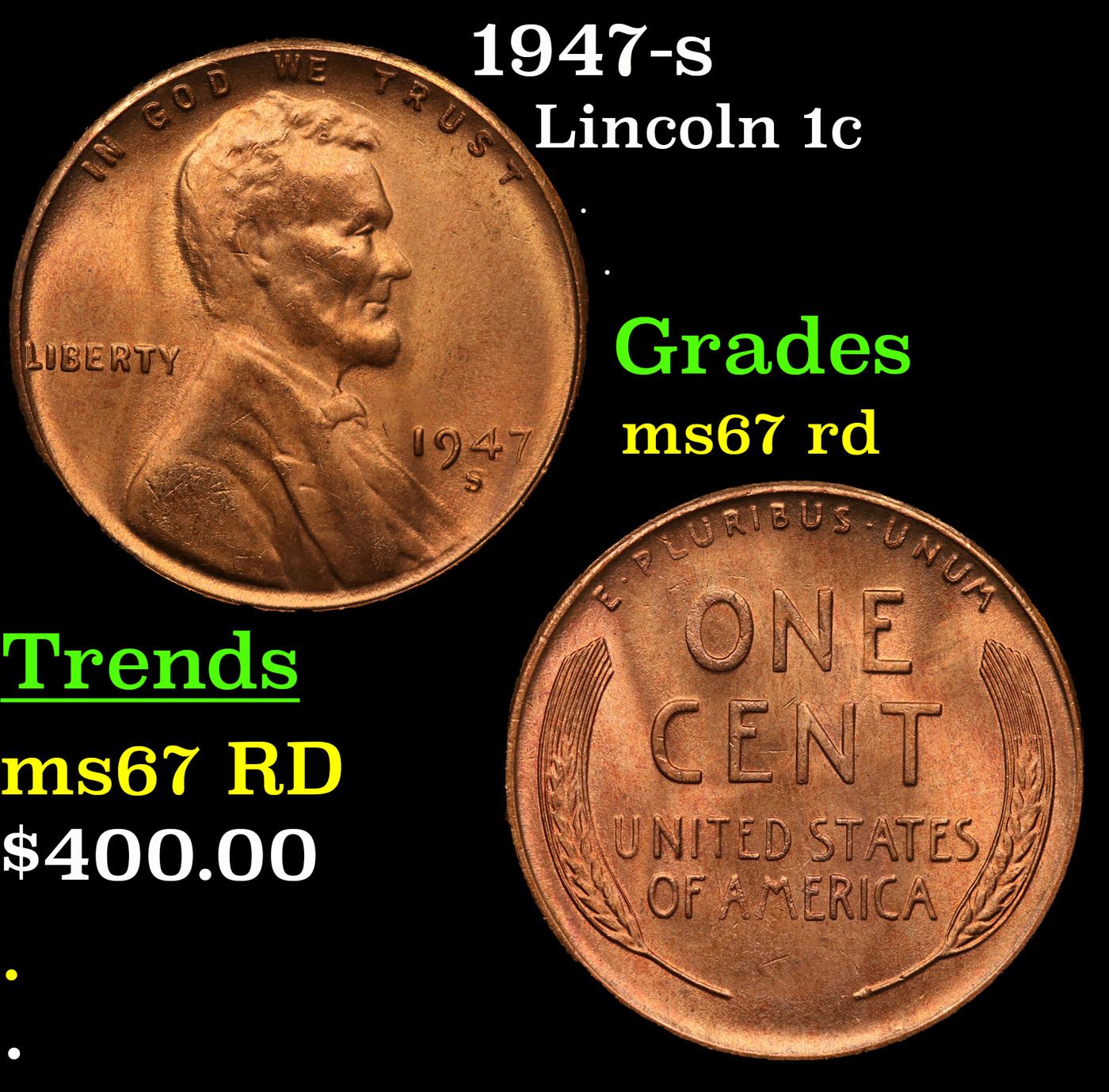 1947-s Lincoln Cent 1c Grades GEM++ Unc RD.