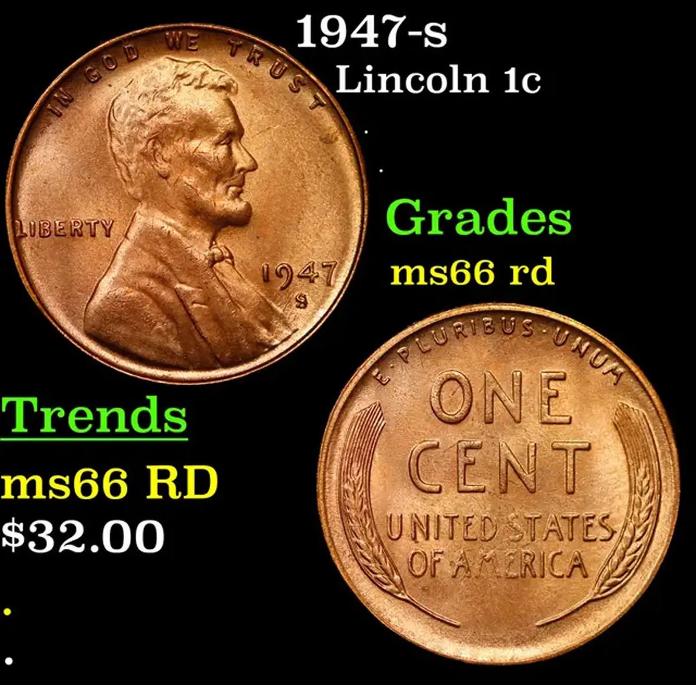 1947-s Lincoln Cent 1c Grades GEM+ Unc RD.
