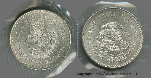 1947 silver Mexico 5 Peso Cuauhtemoc Unc; Large and very popular!