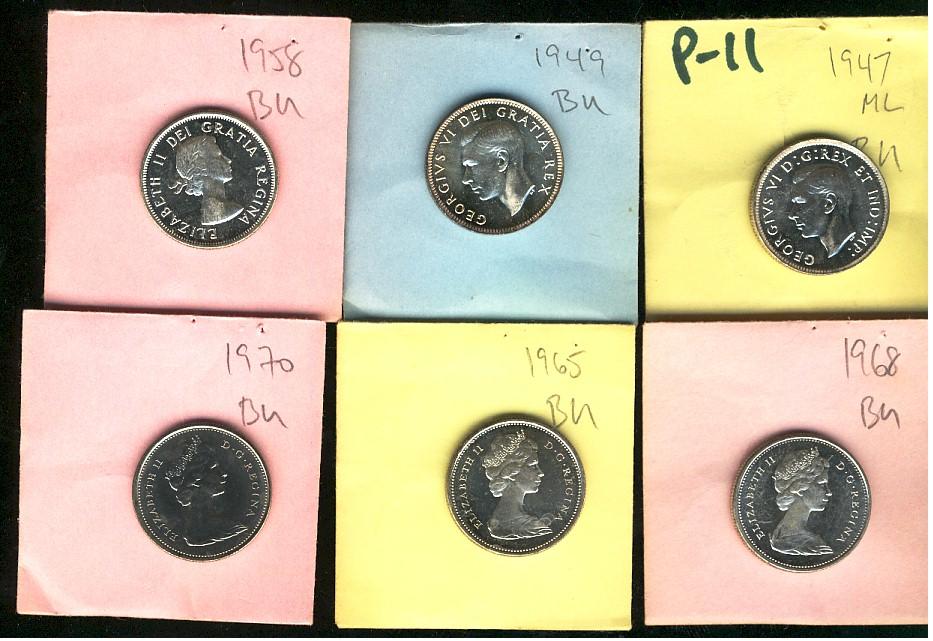 1947ML, 1949, 1958, 1965, 1968 Sil, 1970 25¢. Lot of 6 coins, all MS60 or better
