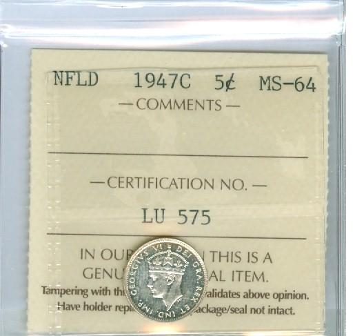 1947c Nfld 5¢ ICCS MS64, superb example. Fully brilliant and lustrous.