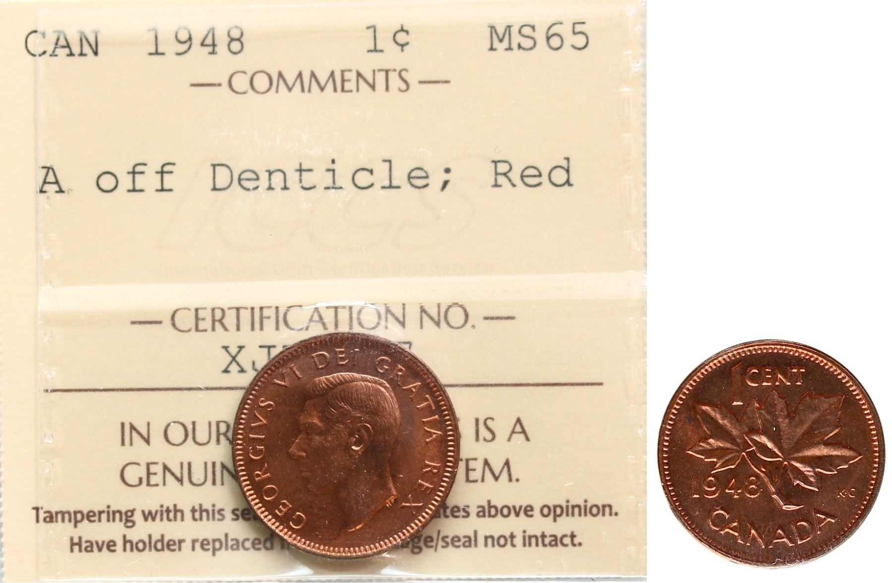 1948 1¢ "A Off Dent" ICCS Gem Mint State-65. Gem 95% Red and lustrous issue.