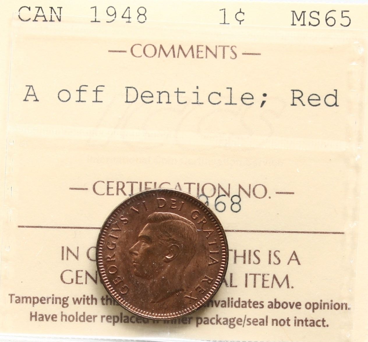 1948 1¢ "A Off Denticle" ICCS Gem Mint State-65 Red.