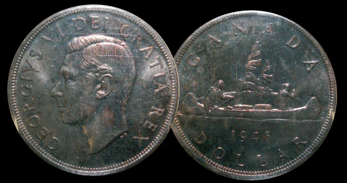 1948 $1 ICCS MS-64, Light tone with full luster. A premium quality example. The coin is fully struck and has full lustre. It has reflective surfaces on both the obverse and reverse and superb eye appeal.