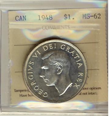 1948 $1 ICCS MS62. Small tone on bottom border.