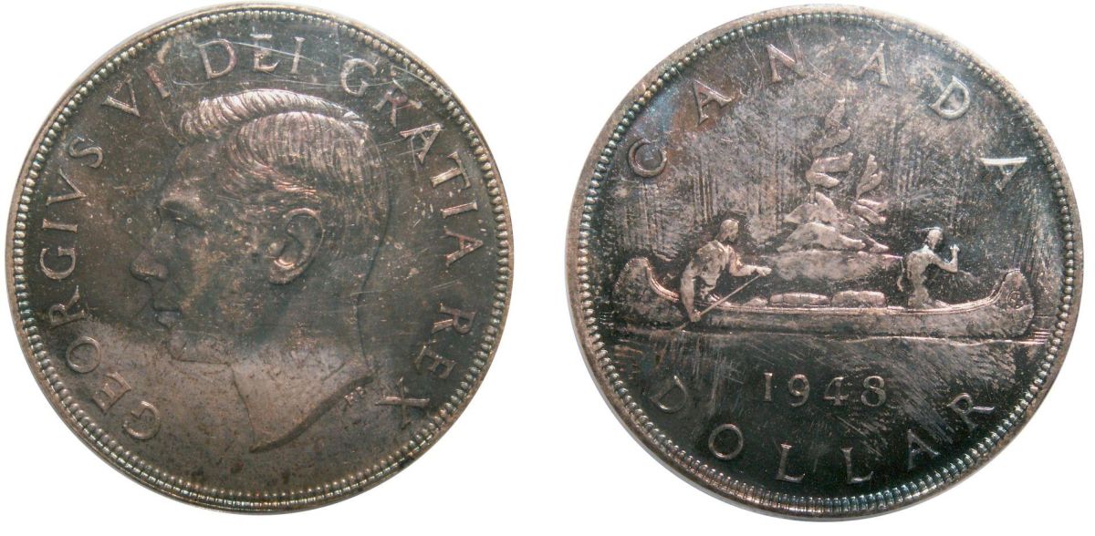 1948 $1 PCGS MS65. A superb key date example. This example shows a gem bluish purple tone on both obv and rev. Rare in this condition.
