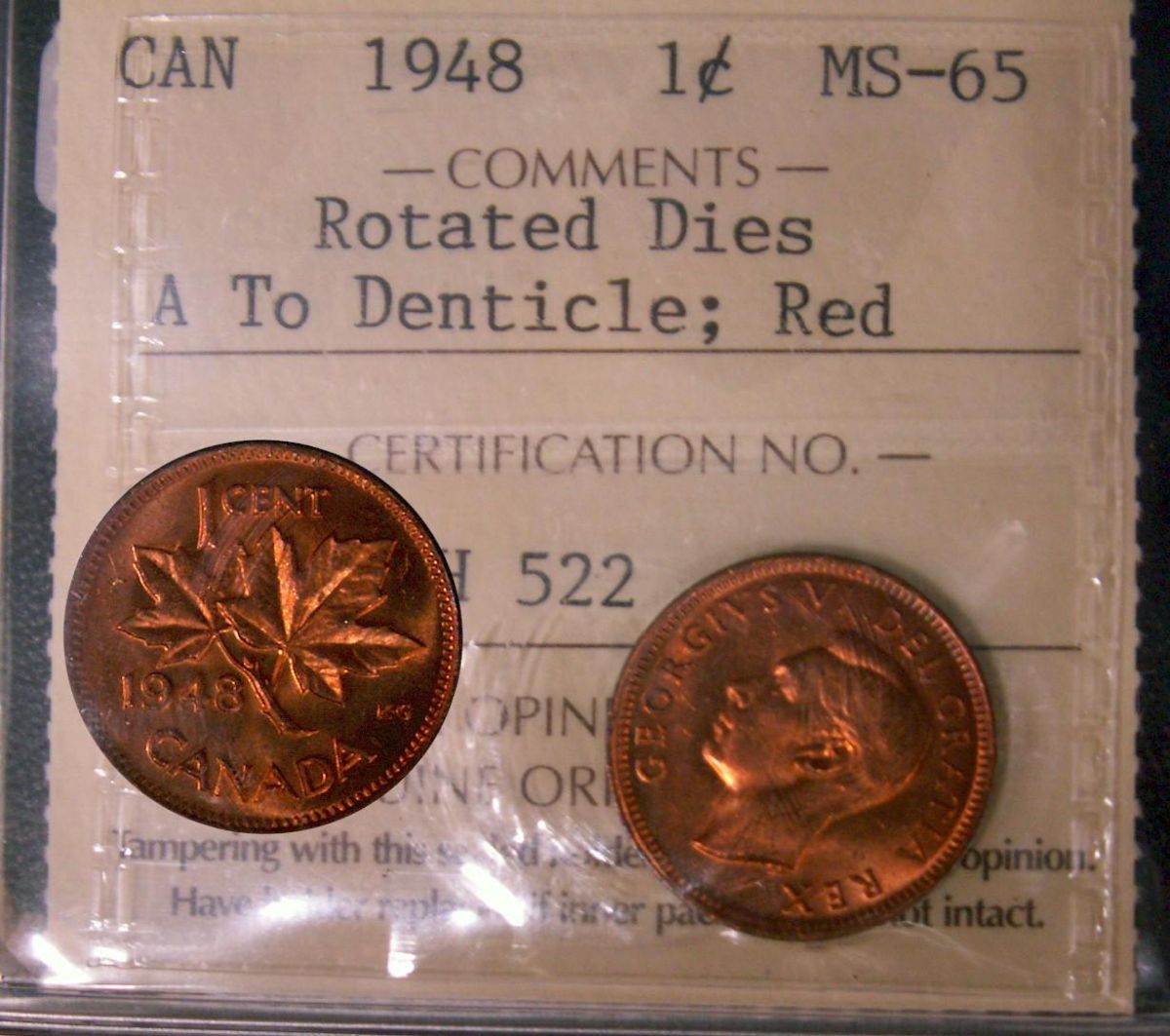 1948 1¢ Rotated Dies A to Denticle ICCS MS65 Red. Scarce