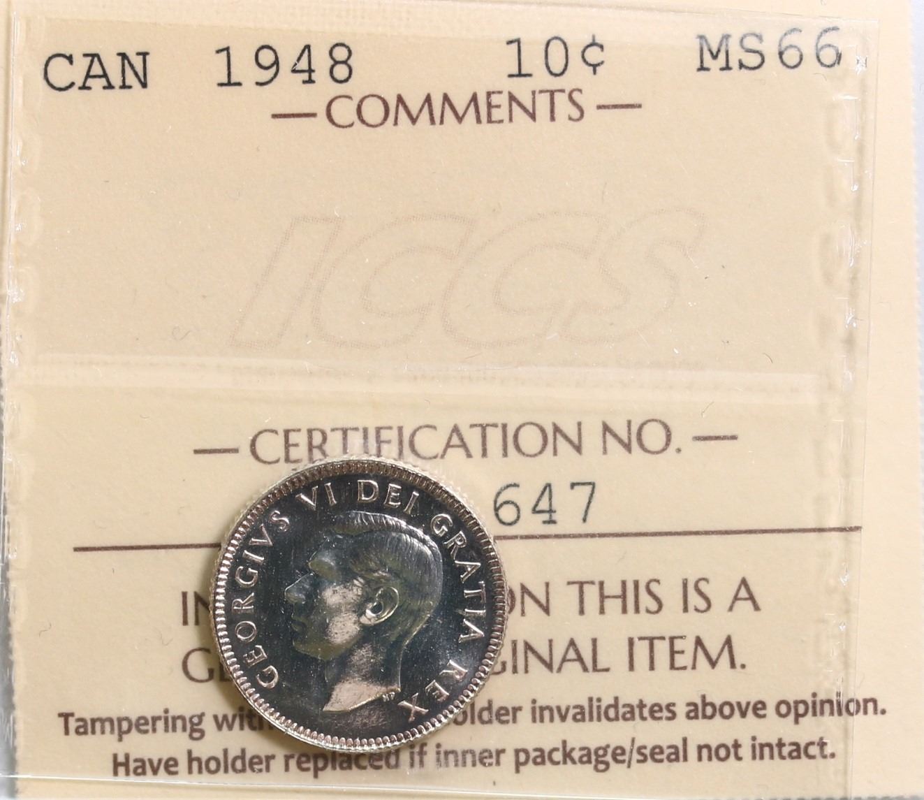The cataloguer has taken every reasonable measure to ensure that all of the lots in this sale are as described and genuine. All raw coins and banknotes have been graded by the cataloger or the auction house which represent our best professional opinion. To grade coins and banknotes, we use Canadian grading standards, 42 years of experience and good conscience. However, grading is a subjective description in the opinion of the cataloger or the auction house. Among experts there are often differences of opinion on the grading and the eye appeal of a coin. The strike and the state of preservation are often debated. The Canadian Numismatic Company acts as an agent between consignors and buyers. The Canadian Numismatic Company does not guarantee that any coin or banknote cataloged will meet the standards, or the grade, of any third party grading companies. No warranty, whether impressed or implied. Items are as is, no warranty given. We cannot accept responsibility and waive all liability resulting in financial losses, and or incidentals accruing from the sale of any items, nor can we guarantee that items graded by third party services will grade the same if submitted to a different grading service or re-submitted to the same company. Statements by The Canadian Numismatic Company regarding the condition, the eye appeal, the strike and the population of items are for guidance only. All lots offered are sold "AS IS". Title to all lots remains with the auction house until paid for in full by the purchaser. But they are held at the risk of the purchaser once the time of the sale.