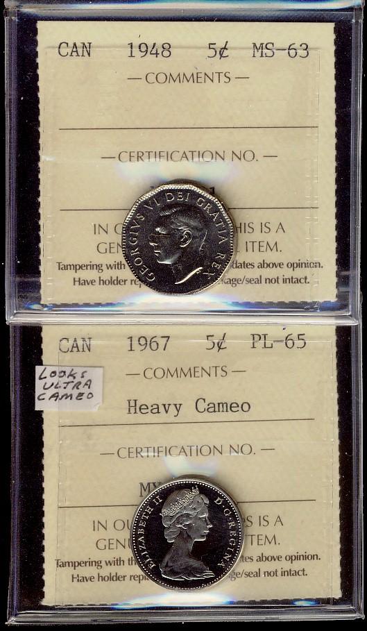1948 & 1967 5¢ both ICCS graded. 1948 MS63 and 1967 PL65 Heavy Cam.