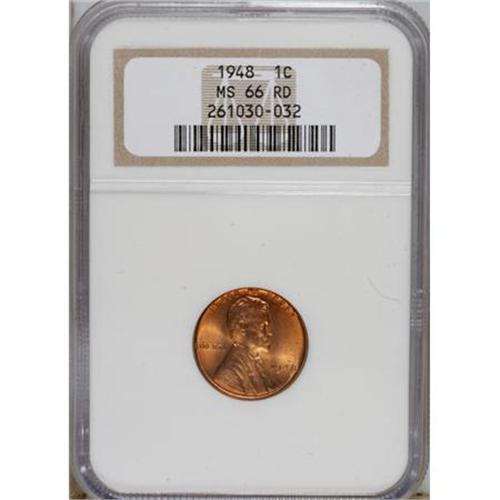 <B>1948 1C MS66 Red NGC.</B></I> NGC Census: (282/51). PCGS Population (282/5). Mintage: 317,569,984. Numismedia Wsl. Price for NGC/PCGS coin in MS66: $40. (#2761)<BR><BR><b>Shipping:</b> Coins & Currency (<a target="_blank" href="http://www.heritageauctions.com/common/shipping.php">view shipping information</a>)