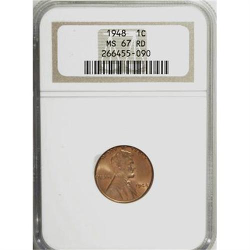 <B>1948 1C MS67 Red NGC.</B></I> . NGC Census: (52/0). PCGS Population (5/0). Mintage: 317,569,984. (#2761)<BR><BR><B>Coin Engraver:</B> Victor D. Brenner<BR><BR><b>Shipping:</b> Coins & Currency (<a target="_blank" href="http://www.heritageauctions.com/common/shipping.php">view shipping information</a>)