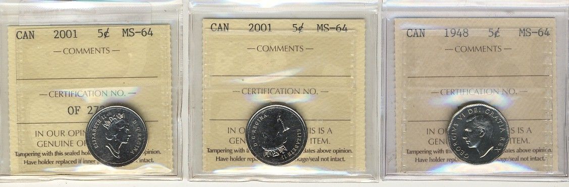 1948 & 2001(2) 5¢ ICCS MS64. Lot of 3 coins.