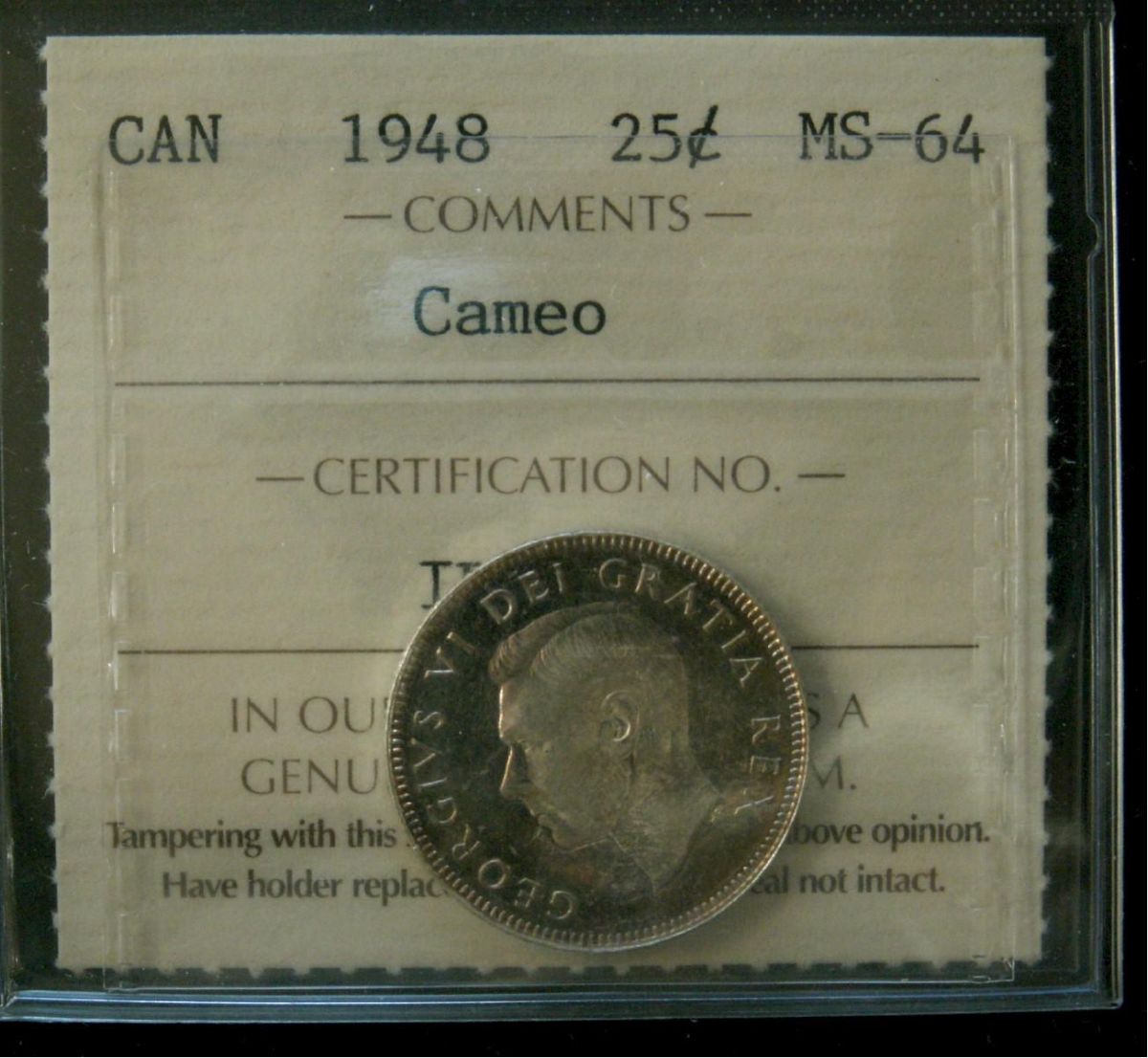 1948 25¢ ICCS MS64 Cameo. Attractive with gold like toning.