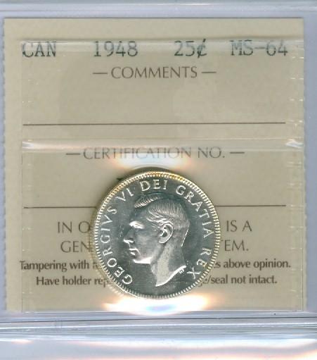 1948 25¢ ICCS MS64. White with lots of lustre.