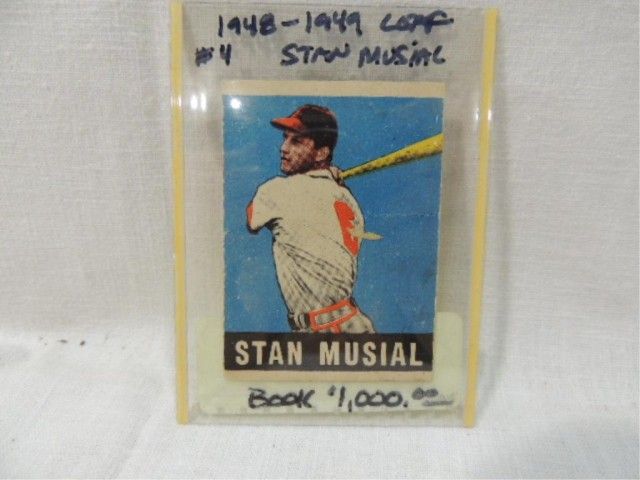 1948-49 LEAF #4 BASEBALL PLAYER CARD STAN MUSIAL. DAMAGE ON BACK OF CARD. AS SHOWN. VIEW PICTURE FOR DETAIL.