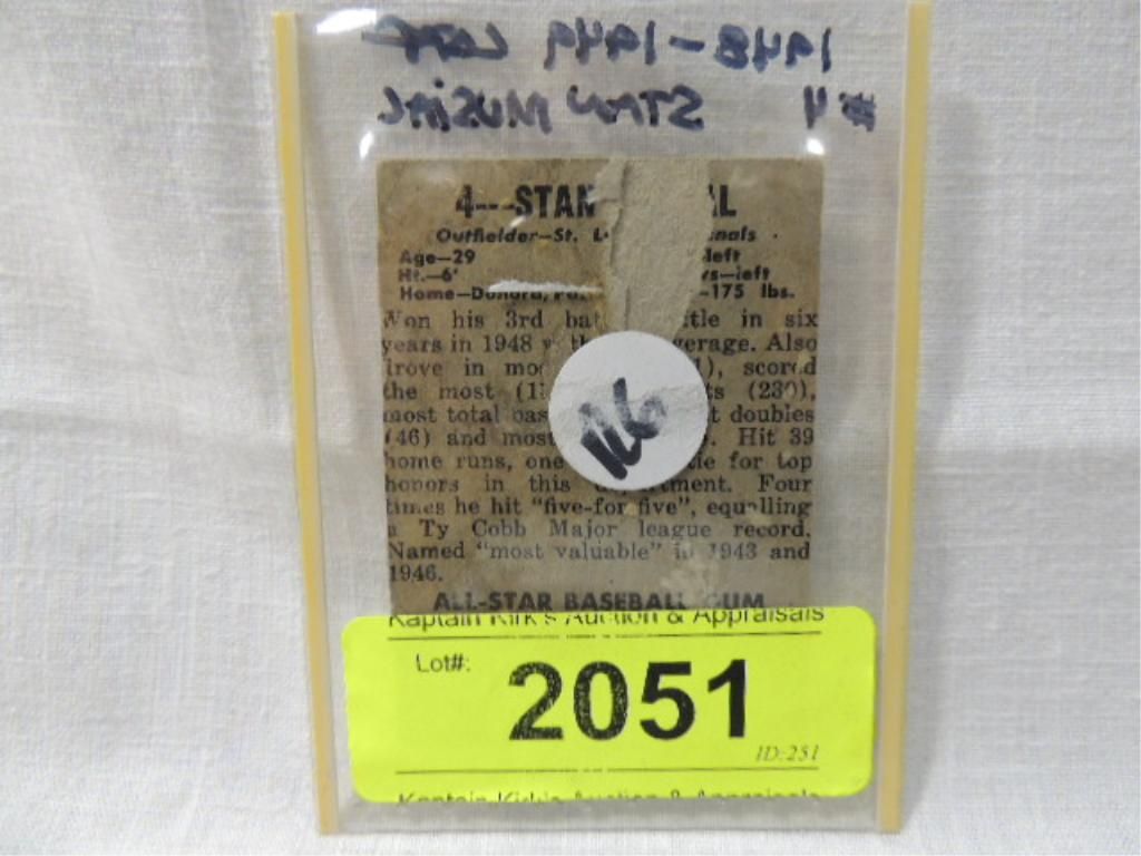 1948-49 LEAF #4 BASEBALL PLAYER CARD STAN MUSIAL. DAMAGE ON BACK OF CARD. AS SHOWN. VIEW PICTURE FOR DETAIL.
