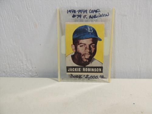 1948-49 LEAF #79 BASEBALL CARD JACKIE ROBINSON. CARD HAS BEEN TRIMMED & SLIGHT DAMAGE TO BACK. AS SHOWN. VIEW PICTURE FOR DETAIL.