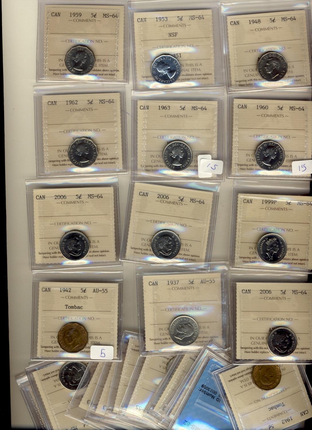 1948 5¢, 1953 NSF, 1959, 1960, 1962, 1963, 1964 Dbl date MS64, 1999P & 2006 MS64 along with 1937 5¢ , 1942 Tom(2), 1996 Far & Near(2) AU55, 1948, 1960, 2006 MS62, 1996 Fr EF40 & 2006 MS63(5). Also includes 1954 PL64 5¢. Lot of 27 coins all ICCS graded e