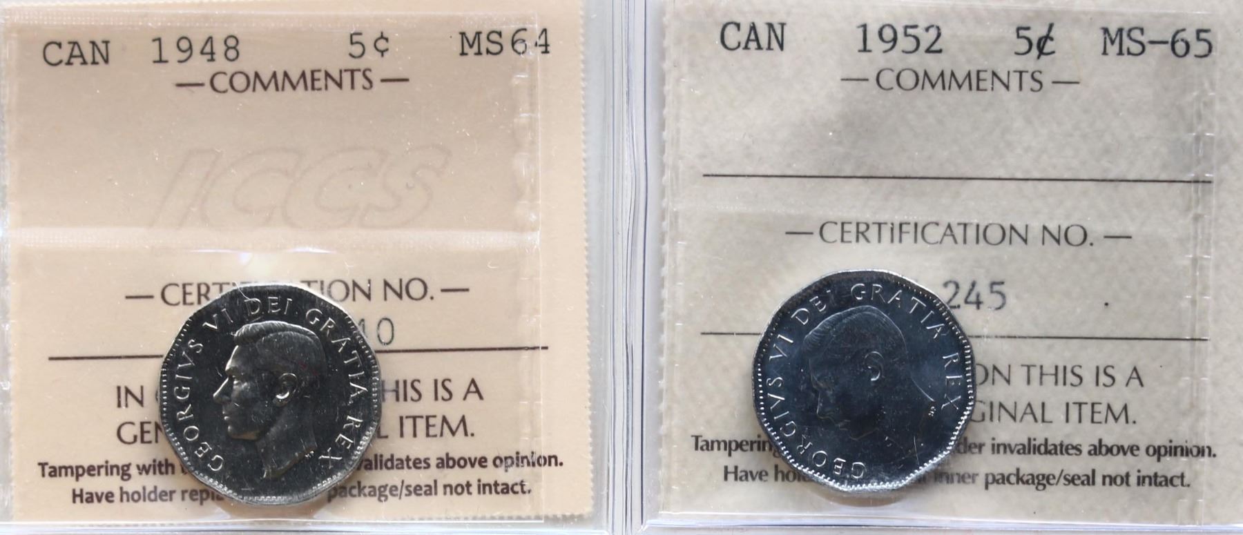 1948 5¢ ICCS Choice Mint State-64, 1952 ICCS Gem Mint State-65. Lot of 2 coins.