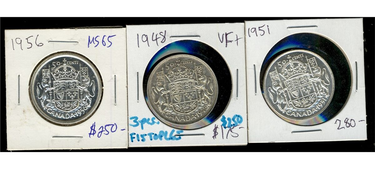 1948 50¢, 1951 & 1956. Lot of 3 coins F15 to PL65.
