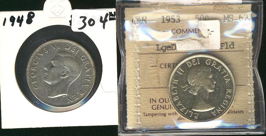 1948 50¢ Fine & 1953 LgDt ICCS MS62. Lot of 2 coins only the 1953 is certified.