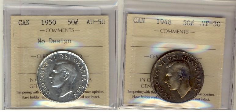 1948 50¢ VF30 & 1950 50¢ No Design AU50. Lot of 2 coins both ICCS graded.