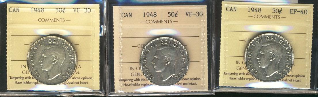 1948 50¢ VF30(2) & EF40. Lot of 3 coins.