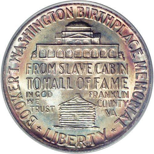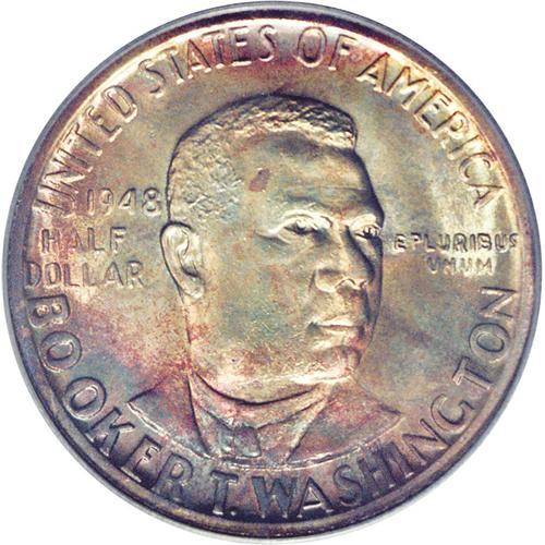 <B>1948<50C> Booker T. Washington MS65 PCGS.</B></I> Exuberantly toned in swaths of apple-green, lemon-gold, and fire-red. Well preserved, since the light marks on the lower cheek were present on the planchet prior to the strike. In a green label holder.