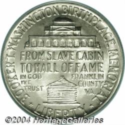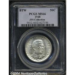 <B>1948<50C> Booker T. Washington MS66 PCGS.</B></I> A lustrous, brilliant, and exceptionally undisturbed premium Gem. The reverse is well struck, as is the majority of the obverse although Washington's jaw is not fully brought up by the dies. The 1948 issue is not to be confused with its high mintage 1946-1947 peers. Sold only as part of a PDS set, just 8,005 pieces were struck. Population: 85 in 66, none finer (6/04).<BR><I>From the JFS Collection, the #1 All-Time PCGS Registry Set.</B></I> <BR><BR><B>Important notice:</B> Heritage usually auctions material at the rate of 200-250 lots per hour. On some occasions eBay Live bid software or the Internet may not be able to keep up with the pace of the auction. We recommend placing a realistic absentee bid now as insurance to avoid disappointment. Occasionally the auctioneer may eliminate or reject an eBay Live bid, and the auctioneer may also reopen a lot after the close of the eBay live bidding (usually because we missed an audience bid), and may reject your bid even if it shows you as the winning bidder. By bidding via eBay Live, you agree that Heritage may award the lot to another bidder at its sole discretion under the circumstances described above or any other reasonable circumstances. Since eBay bids are not shown to us until we open the lot on the floor, we treat those bids just like floor bids. In most cases the floor responds before the eBay bid is presented to us, due to Internet lag time, so for consistency we have made it a policy that floor bids are always considered first over tie eBay live bids. Also please note that all Heritage lots purchased through eBay Live carry a 20% Buyer's Premium. Please make sure you read the Terms and Conditions before you bid. </span></font></tr></table></td></tr></table>