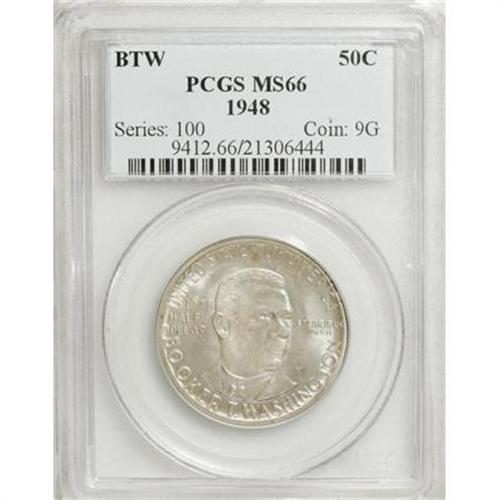 <B>1948 50C Booker T. Washington MS66 PCGS.</B></I> PCGS Population (123/0). NGC Census: (138/8). Mintage: 8,005. Numismedia Wsl. Price for NGC/PCGS coin in MS66: $440. (#9412)<BR><BR><b>Shipping:</b> Coins & Currency (<a target="_blank" href="http://www.heritageauctions.com/common/shipping.php">view shipping information</a>)