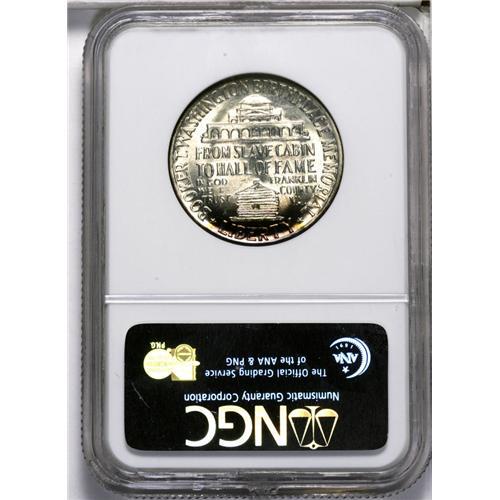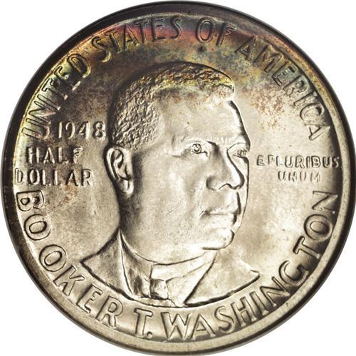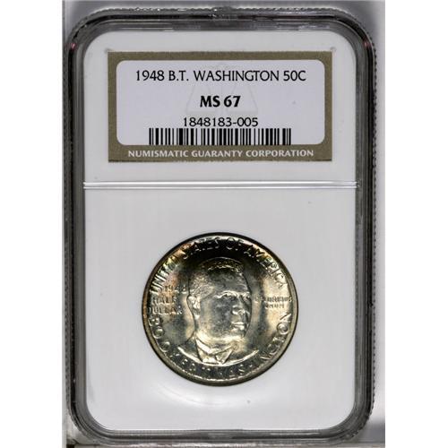 <B>1948<50C> Booker T. Washington MS67 NGC.</B></I> Areas of deep multicolored iridescence are seen at the top of the obverse and the base of the reverse; otherwise, the surfaces are snow-white and brilliant with coruscant luster. A couple of tiny marks are noted on Washington's upper lip and in his hair. Census: 7 in 67, 0 finer (6/06).