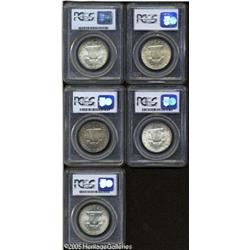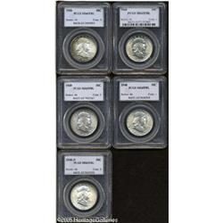 <B>1948 50C MS65 Full Bell Lines PCGS; 1948 MS65 Full Bell Lines PCGS; 1948-D MS65 Full Bell Lines PCGS; 1949 MS65 Full Bell Lines PCGS;</B></I> and a <B>1950 MS65 Full Bell Lines PCGS,</B></I> all are sharply struck, minimally abraded, and lightly toned, except that the '49 has a deeply mottled olive-brown and light green reverse, and the '50 possesses relatively deep multicolored peripheral toning on the obverse.<BR><I>From The Mike Jacobson Collection.</B></I> 5 Coins Lot:8253