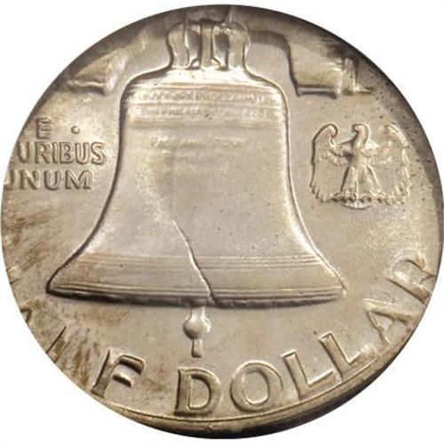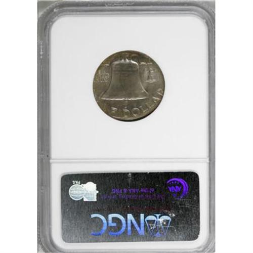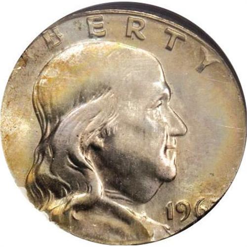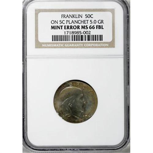 <B>1963 50C Franklin Half Dollar--Struck on a Nickel Planchet--MS66 Full Bell Lines NGC.</B></I> 5.0 gm. Just enough of the final date digit is visible that the date of this piece can be determined, although the mintmark location is entirely off the flan. Fully lustrous light gray surfaces are accompanied by delicate rainbow toning, primarily on the obverse.<BR><BR><B>Coin Engraver:</B> John R. Sinnock<BR><BR><b>Shipping:</b> Coins & Currency (<a target="_blank" href="http://www.heritageauctions.com/common/shipping.php">view shipping information</a>)