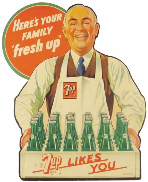 1948 7-Up Die Cut Cardboard Easel Back Sign. Man with case of 7-Up. Pin hole at 12:00 and minor edgewear otherwise very good condition.