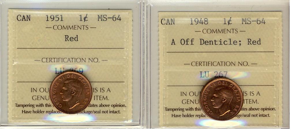 1948 A off dent., 1951 Lot of 2 ICCS graded 1¢ coins, both MS64 Red.
