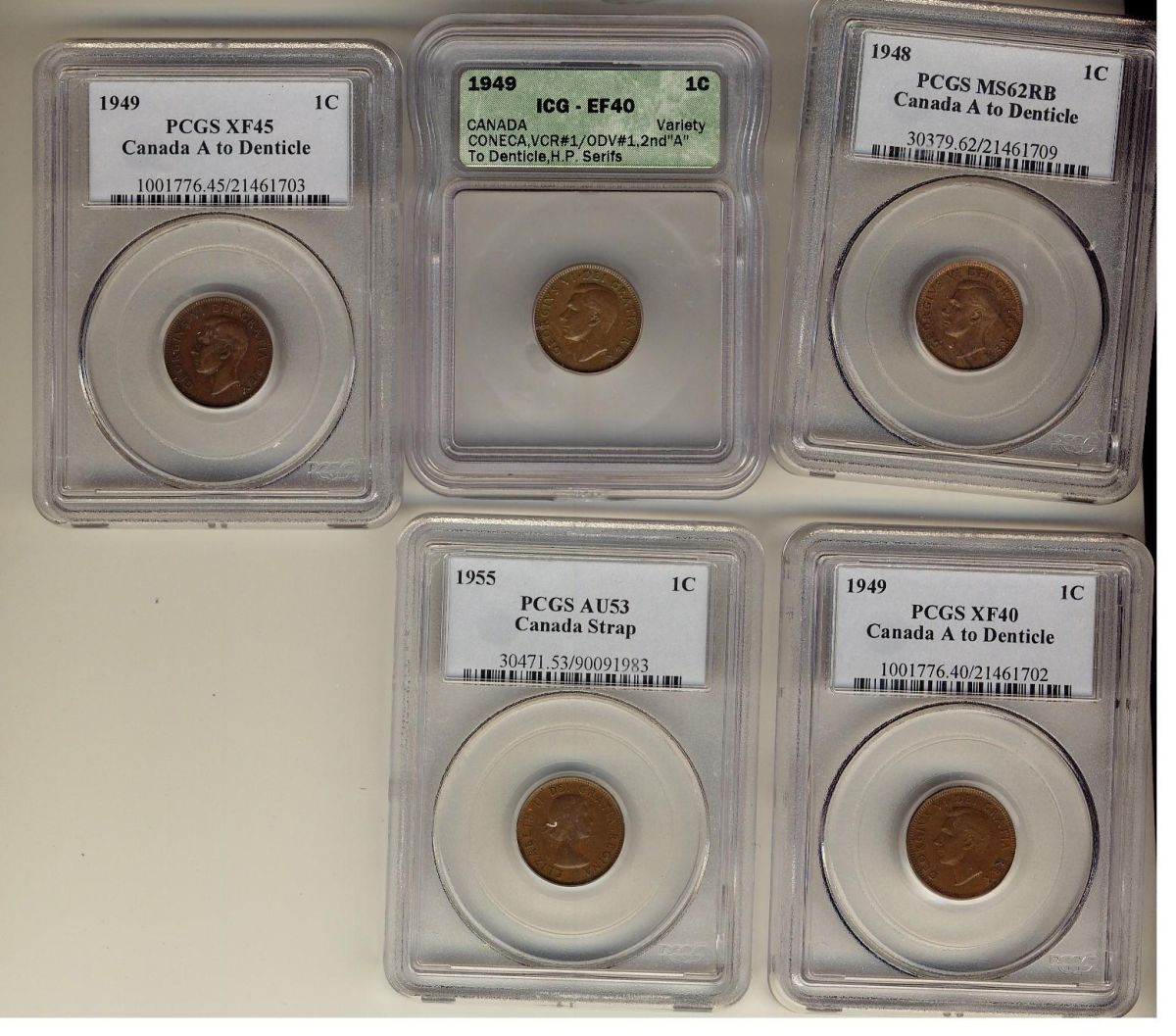1948 A to, 1949 A to (3) and 1955 1¢. Lot of five coins, includes 1948 A to Dent PCGS MS62RB, 1949 A to Dent ICG Effo, PCGS XF40, PCGS XF45 and 1955 SF PCGS AU53.