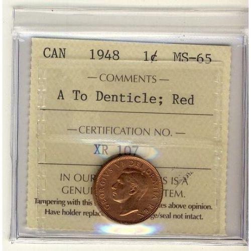 1948 "A" to dent. 1¢ ICCS MS65PQ+ Full Red. Wow! An amazing "George V" Small cent. Excellent strike with clean fields and great surfaces