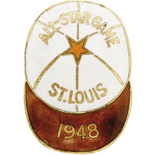 <B>1948 All-Star Game Press Pin (St. Louis).</B></I> Vast areas of white and caramel-toned enamel make this popular All-Star press pin prone to cracking or chipping when exposed to improper handling. Additionally, both caramel and white enamels are commonly found with pigment flaws which sadly detract from this wonderful pin's overall beauty. Breaking from tradition, the offered pin possesses enamels which are unusually clean for the issue and remain uncracked and unchipped throughout. Original threaded post and St. Louis Button Co. nut on verso.<BR><BR><b>Shipping:</b> Miscellaneous Collectibles, Smal (<a target="_blank" href="http://www.heritageauctions.com/common/shipping.php">view shipping information</a>)