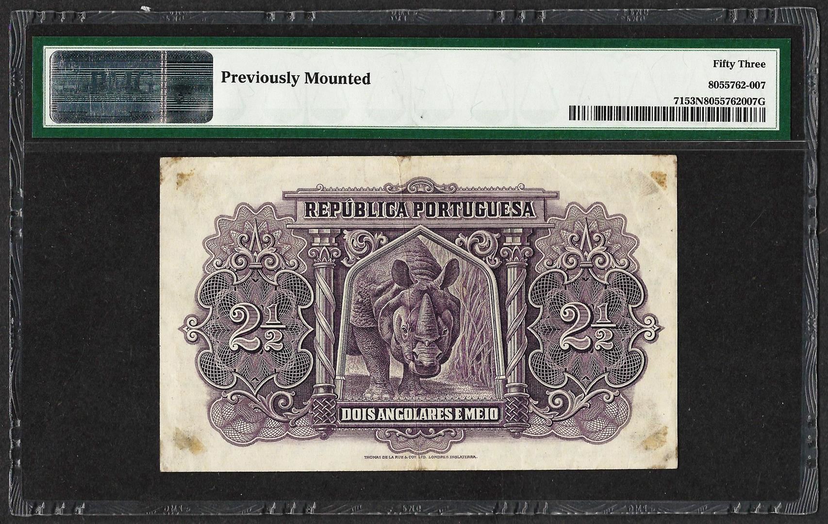 One 1948 Angola 2 1/2 Angolares Commemorative Bank Note PMG About Uncirculated 53 Net. PMG Certified.
