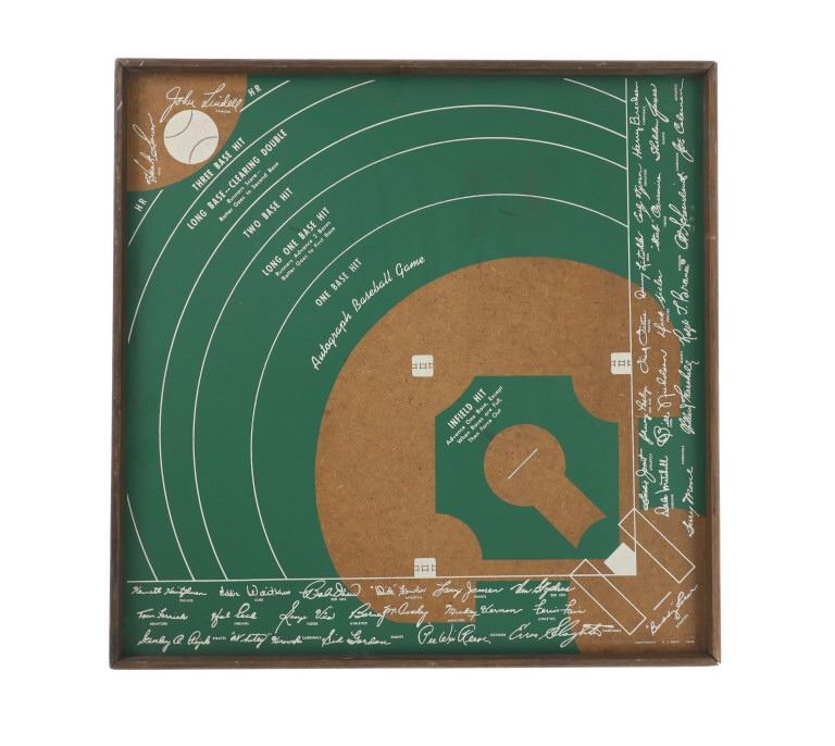 Featured in this lot is this autographed baseball board game circa 1948. The board game features a wonderfully and professionally crafted wooden construction that shows a baseball field painted to its face with different point axis; the facsmile autographs of about (40) of the stars of the time. There was a disk that was shot onto the playing field to determine the play. The condition of this baseball board game shows a well preserved condition that shows some wear marks to the game but otherwise shows well preserved condition. The measurements of this board game is 22 1/2" x 22 5/8" x 7/8".