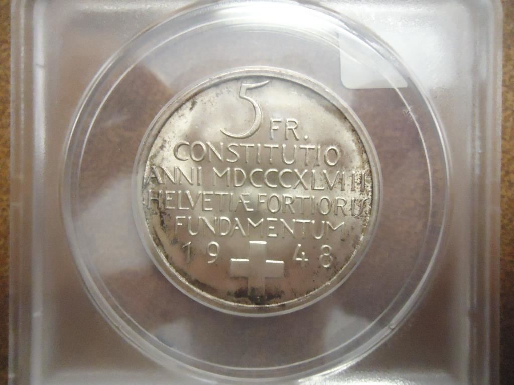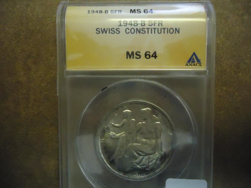 1948-B SWISS SILVER 5 FRANC ANACS MS64