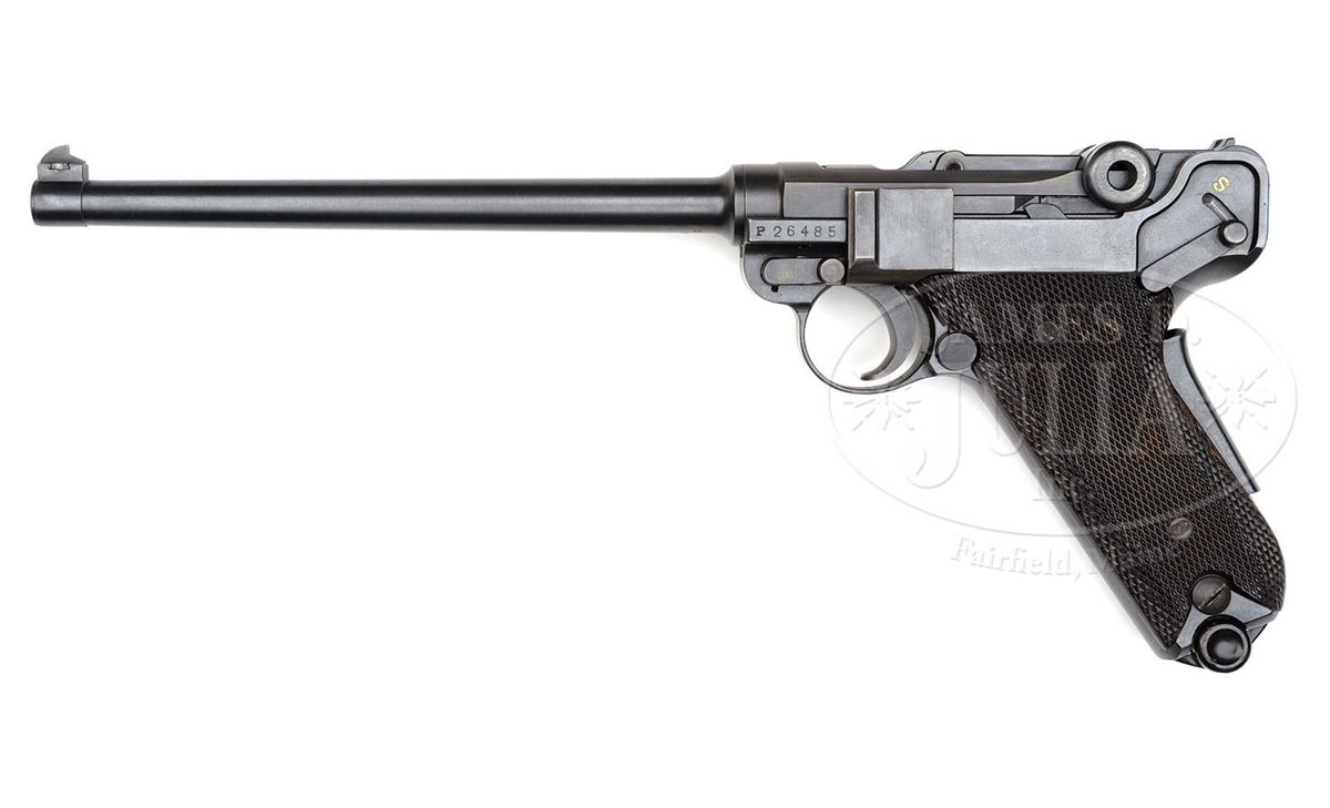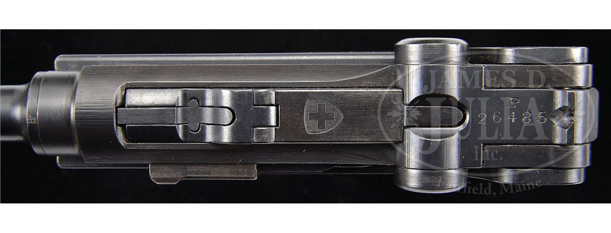 SN P26485. Model 1929 Swiss Luger. 198mm 30 Cal. lightweight bbl. Swiss military inspection marked bbl is serial numbered 4 (underside) of a series of 20 lightweight bbls made by the Waffenfabrik, Bern for the 1949 ISU World Championships in Buenos Aires. Other numbered parts on gun are matching. Swiss cross and shield on center link. "P" proof on left receiver. "44" date in well under takedown lever. Circular "WF" on the back of the frame. Grip safety. Original black plastic grips. This gun is featured on p. 652 in Dr. Geoffrey Sturgess' The Borchardt & Luger Automatic Pistols. A very rare surviving Luger made for this World Championship, most of the batch of 20 being re-barrelled to standard 120 mm length for sale after the competition and the long barrels destroyed. PROVENANCE: Collection of Dr. Geoffrey Sturgess. CONDITION: Condition is near mint retaining 99% of the original blue. Bore is bright and sharp. Grips are excellent. Proper Swiss dark brown plastic bottom magazine is excellent. Mechanics are excellent. 4-52851 BWS18